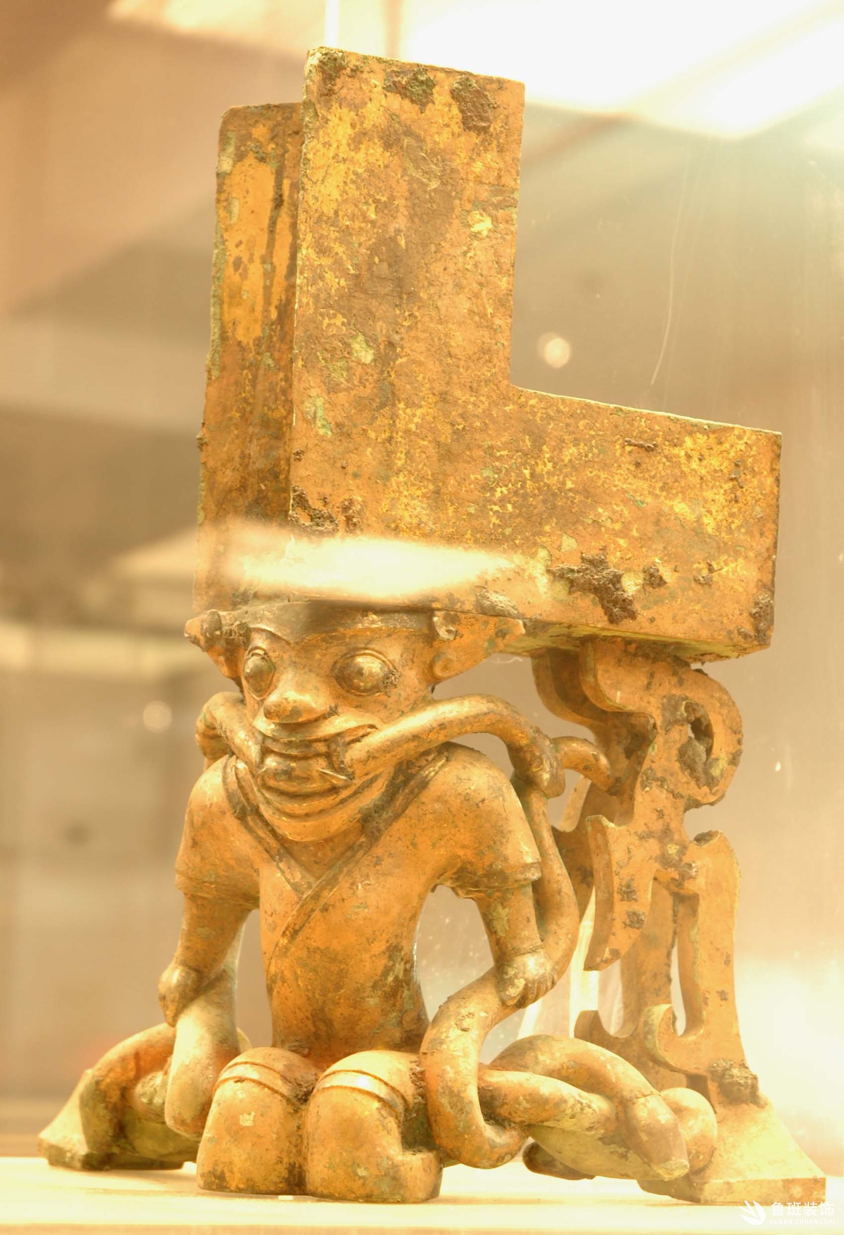 西漢。通高31.5、橫長(zhǎng)15.8cm。結(jié)構(gòu)分上下兩部分:上半部為兩個(gè)大小相同的扁長(zhǎng)方套筒組成的活頁,可作90度展開,為屏風(fēng)右翼障的下轉(zhuǎn)角構(gòu)件。下半部為力士托座,取自“越人操蛇”的傳說。力士身著右衽褐衣,短褲,跣足。兩眼圓瞪,眼珠外突,口咬一兩頭蛇。雙手操蛇,雙足跪坐夾蛇,五條蛇相互絞纏,玲瓏通透。是兩千多年前越人抓蛇吃蛇形象的再現(xiàn)。原通體鎏金,并有黑漆繪線,現(xiàn)僅留斑點(diǎn)。現(xiàn)藏于:廣州西漢南越王博物館 。