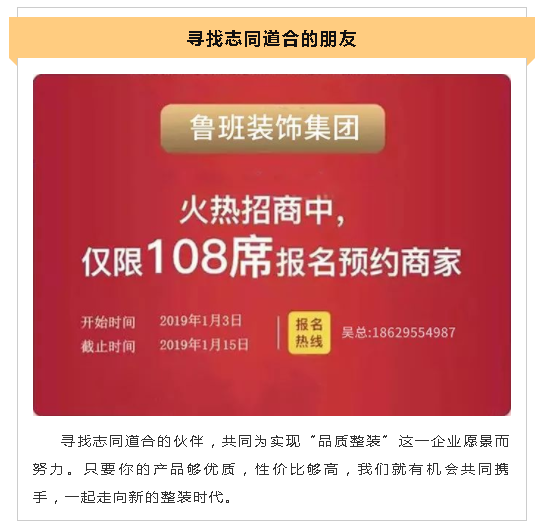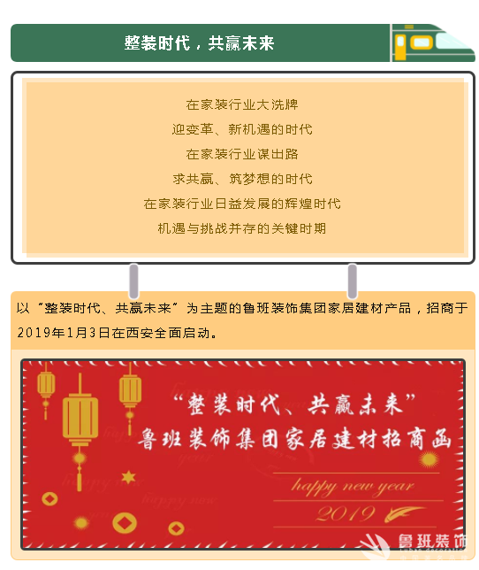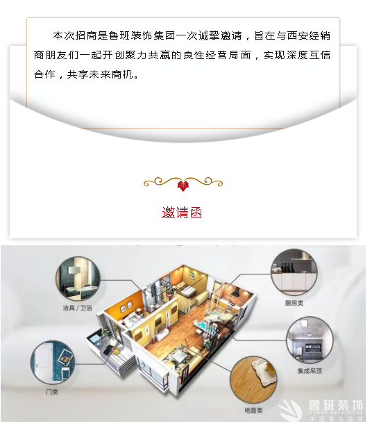 魯班裝飾發來邀請函:“整裝時代、共贏未來”魯班裝飾集團家居建材招商開始啦…。”感謝您的閱讀,希望可以為您家的新房裝修保駕護航,魯班裝飾-品質生活締造者,更多裝修問題請致電:400-887-0023。